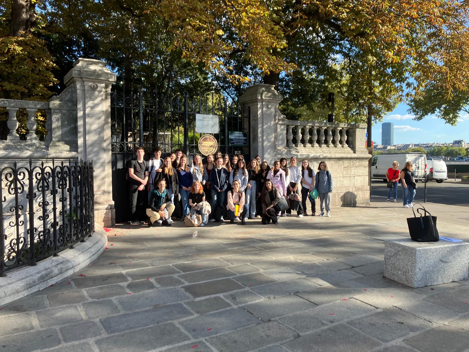 Élèves du groupe de terminale Bachibac ainsi que leurs enseignantes en section Bachibac, Mmes Bartomeu et Le Cam, devant le jardin des Combattants, Place de l’Hôtel de Ville à Paris, le mardi 30 septembre 2025.